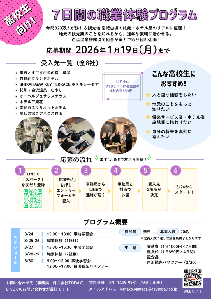 白浜温泉旅館協同組合(所在地:和歌山県白浜町)は、白浜エリアの旅館・ホテルを舞台に、高校生がリアルな仕事に触れ、学び、成長する7日間の職業体験プログラム 「未来創造プログラム『スパーク』」開催を決定 しました。