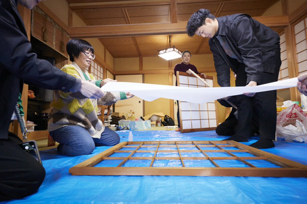 障子枠に丁寧に糊を塗り、新しい真っ白の障子紙を貼っていく様子は、大人が全員で童心にかえっていくようでした。