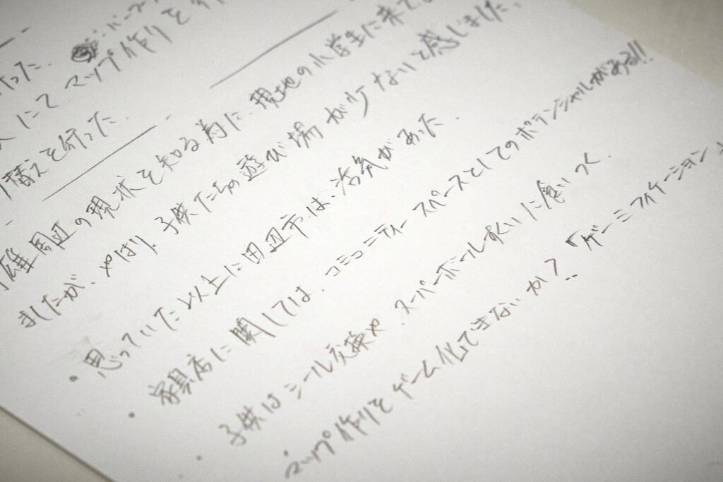地域の小学生も参加して、「ここは危ない」「遊び場がない」などの、リアルな意見を共有できました。実際に手を動かして、街の情報を見える状態にすることで、課題が見えた時間でした。